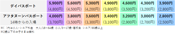 ・通常料金:デイパスポート/通常営業日3,600円、夜間営業日4,200円